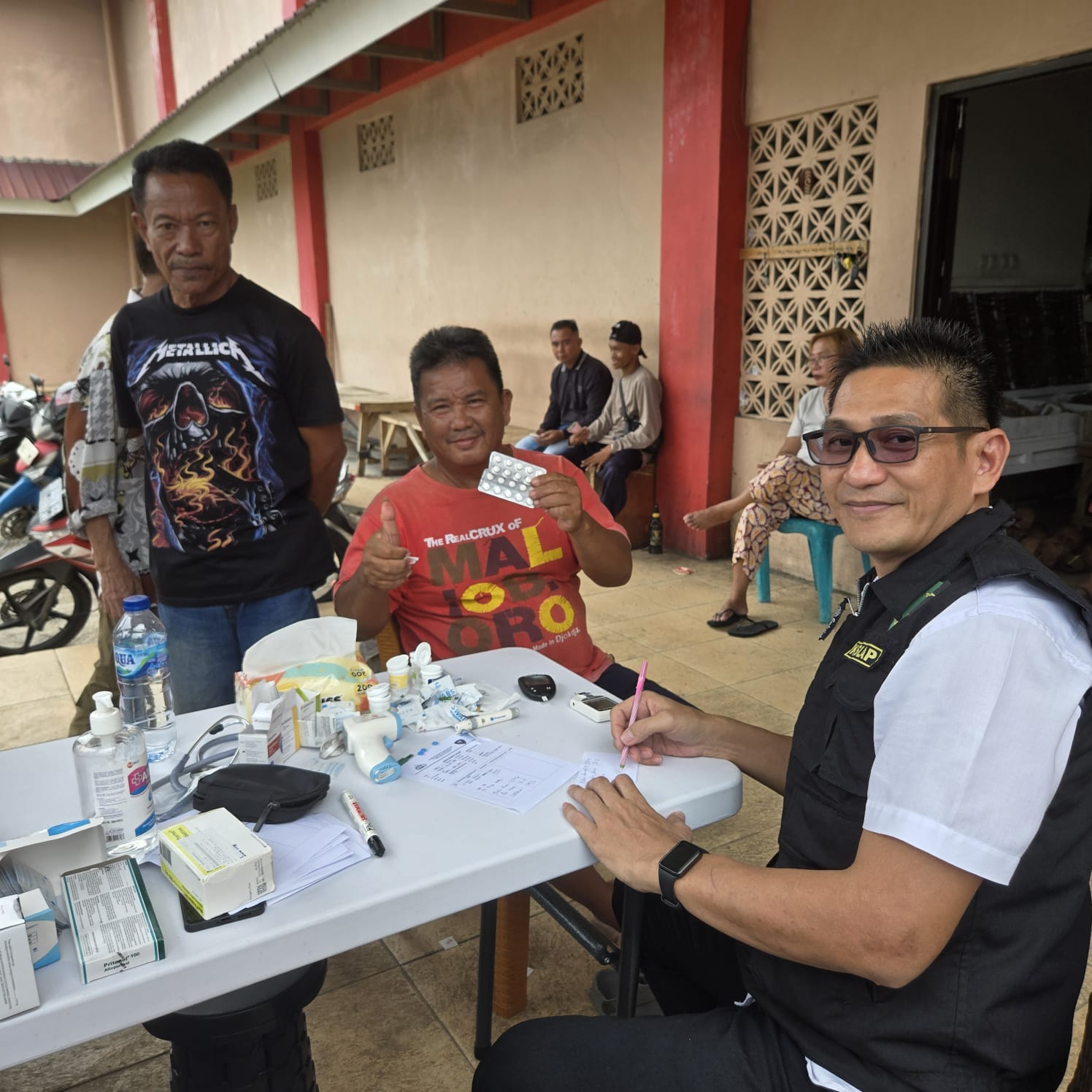 Kegiatan yang dimulai pukul 09.00 WITA ini dipimpin oleh dr. Victor W. Tumbuan sebagai penanggung jawab, didampingi oleh Kasi Kes Bripka Fauzan Wahibu dan Perawat Mitra Apri E. Marampa, Amd.Keb. Tim kesehatan Polres Bitung memberikan pemeriksaan kesehatan dan pengobatan gratis kepada masyarakat umum.